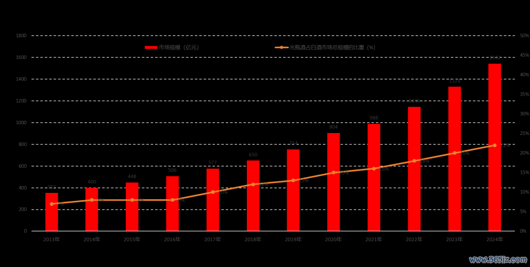 汾酒50元光瓶“玻汾”、西凤40元傍边光瓶“绿玻”,古井贡“乳玻”“小郎酒”“江小白”畅销大江南北,爱喝酒的老酒友,还有许多追求前卫的年青东谈主爱不释口,新近洋河、泸州、五粮液等皆推出光瓶致使低度光瓶酒,光瓶酒迎来春天。近10年光瓶酒悄然较大幅度集会增长,2024年已蹂躏1545亿,预测近两年会蹂躏2000亿。