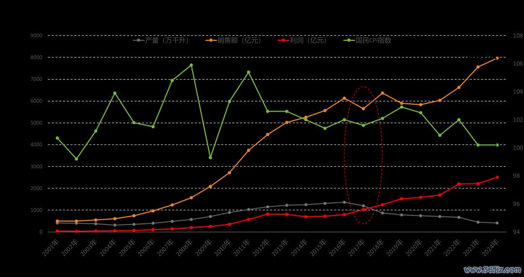 但自2017年头始,上述趋势初始出现背离,产销逐年急剧下滑,至2024销量仅有414万吨下落三分之二多,但销售收入7964亿增长30%、利润2509亿增长315%,其中茅五汾泸洋TOP5占行业利润60%。